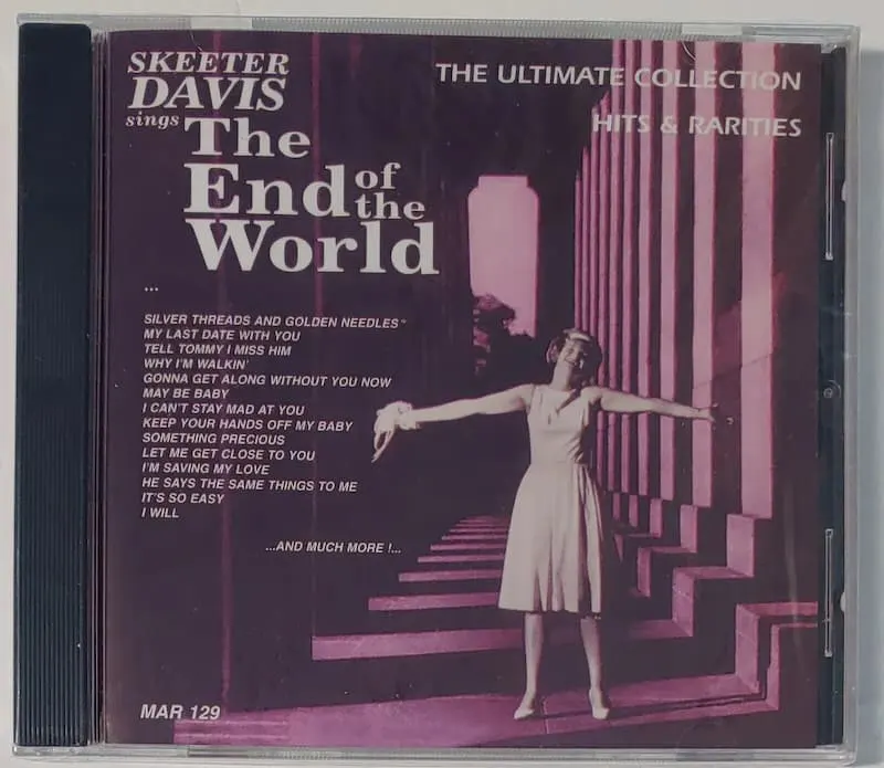 “The End of the World” is a pop music hit by Skeeter Davis that enjoyed international success in the 1960s. The record was released by RCA Records in December 1962 and reached its greatest success in March 1963, peaking at #2 on the Billboard Hot 100 pop chart, #2 on the Billboard country singles chart (Davis was a country music vocalist and the record was a crossover music success), and #1 on Billboard’s adult Contemporary – easy listening chart. The record also was a #4 hit on Billboard’s rhythm and blues chart – making Davis one of the very few Caucasian female vocalists to enjoy a top ten record on that chart. Davis’ four-chart top ten accomplishment has never been duplicated by any other female vocalist in the history of the Billboard charts.